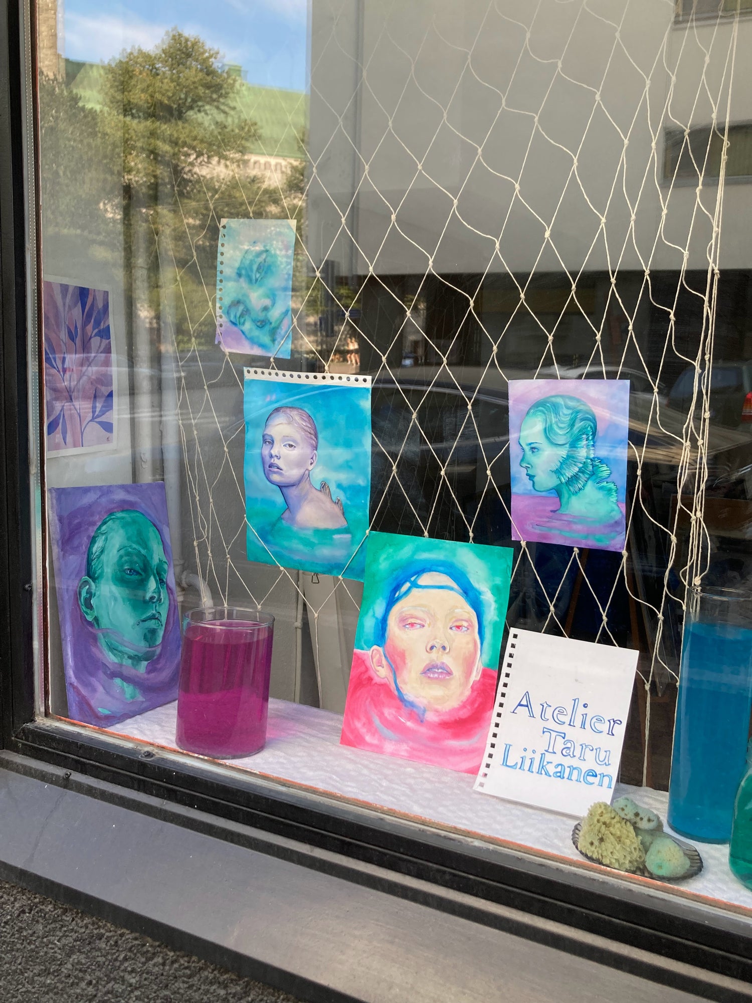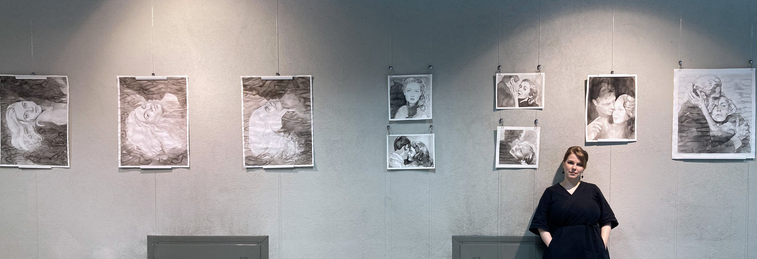 Taru Liikanen makes dreamy black and white paintings with ink. Liikanen works with references from the history of cinema. She studies films with painting with a particular fascination in depictions of women. She has made studies on Alfred Hitchcock´s films, especially Vertigo, and the Finnish actor Regina Linnanheimo.